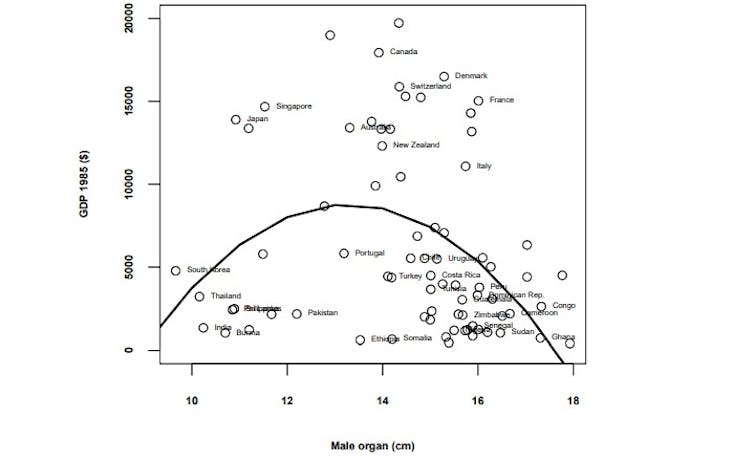 Buscando correlaciones entre ambas variables dijo haber encontrado una significativa para 76 de esos países en el año 1985. Sus conclusiones se resumen en la siguiente gráfica publicada en el artículo: en el eje vertical se indica la renta per cápita en miles de dólares, y en el horizontal la dotación genital de los señores expresada en cm.